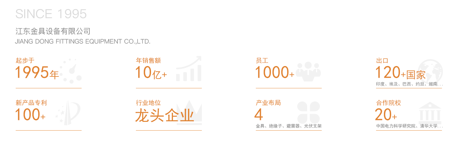 江東金具設(shè)備有限公司系江蘇中天科技股份有限公司(上市代碼600522)全資子公司,創(chuàng)建于1995年,注冊資金55140.91萬元整,占地146000平方米,擁有118000平方米的標(biāo)準(zhǔn)廠房,共有員工1000人,其中工程技術(shù)和研發(fā)人員150人,是專業(yè)制造金具、絕緣子、避雷器和光伏支架等產(chǎn)品的高新技術(shù)企業(yè)。